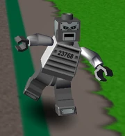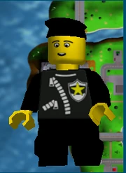 Officer Nick Brick is ane of LEGO Isle's police officers and has an extremely impressive memory, remembering everything he notices, rendering him the all-time detective around. In the first game, Nick'due south mannerisms and speech patterns are based on those of Joe Friday, the police force sergeant in the Dragnet television series. He is usually seen patrolling the island on foot or on a motorbike. He is also found issuing fines to the cyclists watching the races at the race runway, or humourously unloading packed bricks (human and animals) out of the motorbike into the Police Station. In the 2d game, he deputizes y'all and then that yous can take the helicopter (though you can use it really anytime) and tells you lot to go to the desert where a page is. In Isle Xtreme Stunts, he issues you your driver's license, though Pepper is able to drive anytime. His one drawback is the lack of a nose; every bit a issue, he cannot find a olfactory property. (It's always noted that no character, or their physical minifigure counterpart, has a visible nose.) His favorite food is frosted doughnuts and his favorite colour is brown. Nick's introductory video is a mystery-thriller type showing him doing his job and taking pride in it while narrating. Nick makes appearances all three games. In LEGO Isle, he is a playable character.